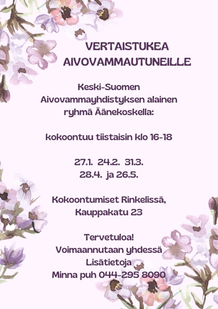 Toimintaryhmä 27.1, 24.2., 31.3., 28.4., ja 26.5. Klo 16-18, potilas- ja vammaisjärjestöjen toimitila Rinkeli, Kauppakatu 23.