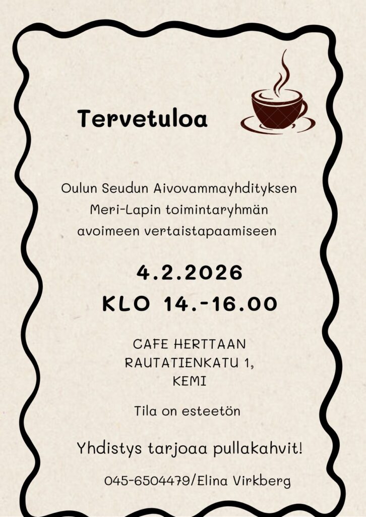 Oulun Seudun Aivovammayhdistys ry:n Kemijärven vertaistukiryhmän vertaistapaaminen pidettiin 6.10. Kahvila ParrunPätkä, Taivaan tulien aukiolla Kemijärvellä.